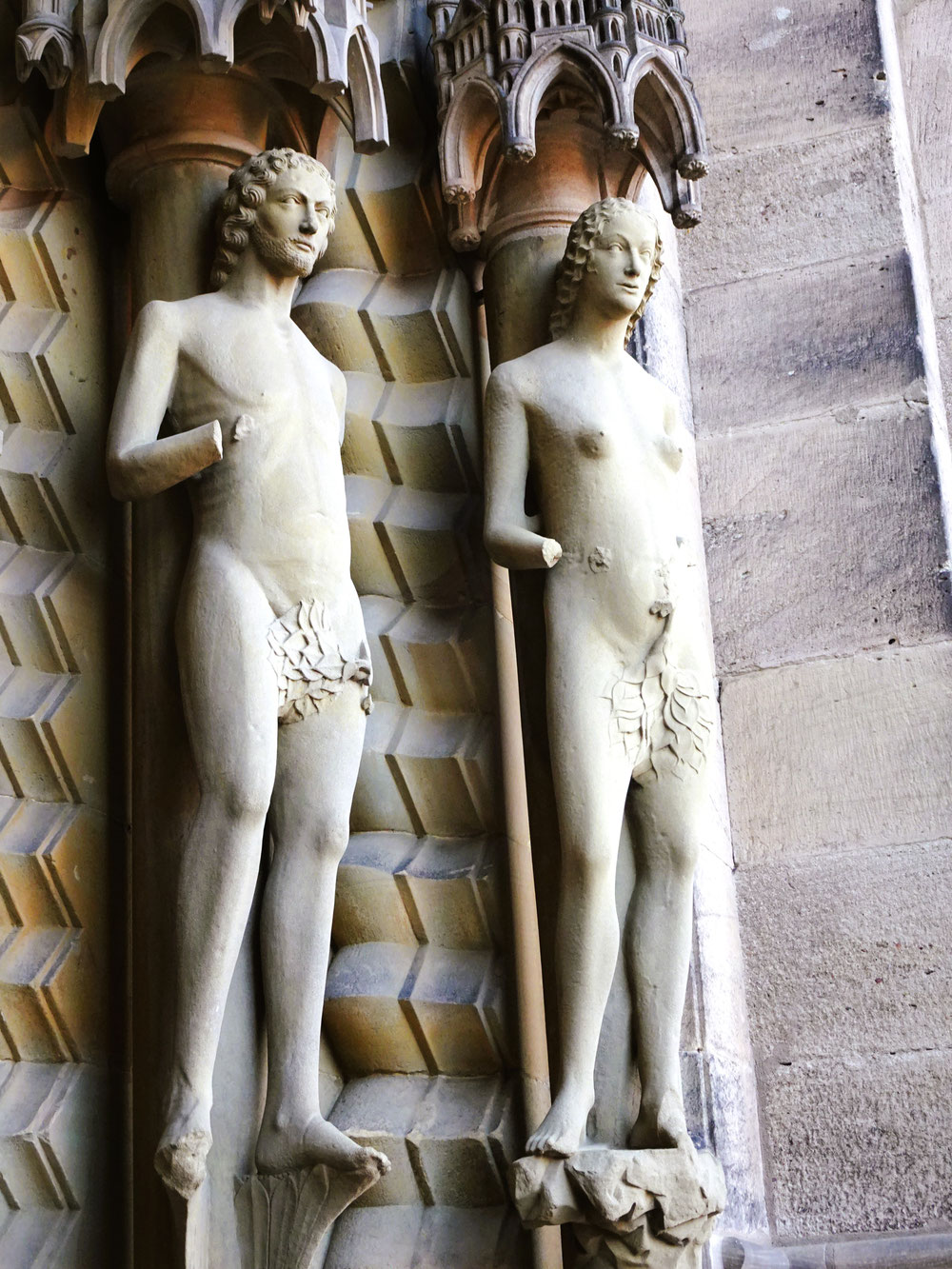 Bild: Der Segen (bene-dicere: gut-heißen) des Schöpfers gilt dem sexuellen Menschen („Fleisch“) nur insofern, als er im Glauben erfüllt und bestimmt ist vom „Geist“ (Joh 6,63; Röm 8,8f). Abram wird zum großen Segen und Urbild des Glaubens durch den Bund der Beschneidung (Vorausbild der Taufe) mit der Einfügung des 5. Buchstabens He (= 5) in seinen Namen zu Abraham (Gen 17,5). Der Geist führt alle Zweiheit der endlichen Gegensätze zur unendlichen Einheit. Außerhalb der Einehe als „Ursakrament“ werden Mann und Frau nicht „ein Fleisch“ (Gen 2,24) und „ein Geist“ (Eph 4,4), schon gar nicht Mann und Mann oder Frau und Frau. Fruchtbar ist die einende Liebe im Sinn des „bauenden“ Schöpfers (vgl. Gen 2,22; Mt 16,18), was „die Zweiheit als Baugesetz alles Kreatürlichen“ einschließt (Alfons Auer), gerade als Gegensatz-Einheit im sakramentalen Bund, aber nicht, wenn der Gegensatz nivelliert und „gleich“ gemacht und der Bund gebrochen wird, worin die „Ursünde“ besteht. Adam und Eva, Dom zu Bamberg, Eingang.
