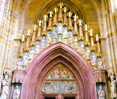 Bild: Der Antisemitismus nimmt nicht nur in Deutschland ständig zu. Das Neue Testament scheint in manchen Passagen eine anti-jüdische Haltung einzunehmen, wie umgekehrt die jüdischen Autoritäten Jesus ablehnen und letztlich töten lassen. Aber es gilt: „Das Heil/ die Hilfe kommt von den Juden“ (Joh 4,22); Jesus = Jehoschua bedeutet entsprechend: Der Herr (JHWH) hilft. Aber diese göttliche Hilfe ist „Gnade“, chen, 8-50, jenseits aller Gesetzmäßigkeit im Symbol der Sieben (und 7 x 7) als „Mondzahl“: eine Mondphase gilt als Maß der Zeit überhaupt. Der Gekreuzigte und am „achten Tag“ (= Sonntag) Auferstandene ist Gottes Gnade in Person im oder als Sakrament. Die Jüdin Edith Stein hat das (nach der Lektüre von Teresa von Avila) verstanden und ließ sich 1922 taufen. Als getaufte Jüdin und Karmelitin ging sie in Auschwitz in die Gaskammer „für ihr Volk“, das jüdische und deutsche, zur „Sühne“ für die jeweils ganz unterschiedliche Schuld. Michael Triegel-Altar, Basilika Kloster Wechselburg.