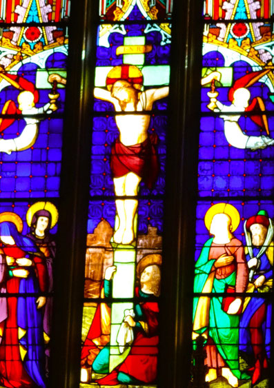 Bild: Immer am 14. September – in diesem Jahr ein Sonntag – feiert die Kirche das Fest Kreuzerhöhung; es geht zurück auf den Brauch, am Tag nach dem Weihefest (13. Sept. 335) der von Kaiser Konstantin initiierten Grabes- oder Auferstehungskirche in Jerusalem dem Volk das Holz des Kreuzes „hocherhoben“ zu zeigen. Zu verdanken ist es der Wunderbaren Auffindung des Wahren Kreuzes Christi durch die Kaisermutter Helena. Im Zentrum des Evangeliums des Tages steht Joh 3,14: „Wie Mose die Schlange in der Wüste erhöht hat, so muss [am Kreuz] der Menschensohn erhöht werden, damit jeder, der an ihn glaubt, in ihm das ewige Leben hat“ (die Stelle nimmt Bezug auf Numeri 21,8f). Der Gekreuzigten zwischen den vier Frauen mit Maria links und dem einen Lieblingsjünger rechts erhöht am grünen Holz; Engel rechts und links fangen mit Kelchen sein kostbares „Blut des Bundes“ auf; am Fuß des Kreuzes kniet Mara Magdalena: Kathedrale St. Michael (19. Jh.), Toronto, Kanada.