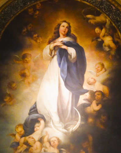 Bild: In der orthodoxen Kirche beginnt das Kirchenjahr nicht am 1. Advent, sondern schon am 1. September. Das erste Fest, das gefeiert wird, ist „Mariä Geburt“ am 8. September; davon abgeleitet ist das jüngere Fest der Unbefleckten Empfängnis Mariens neun Monate zuvor am 8. Dezember. Nur bei Jesus, Maria und Johannes dem Täufer feiert die Kirche auch den Geburtstag, ansonsten immer nur den Todestag (als „ewigen“ Geburtstag). Marias Mutter ist Anna, hebr. chana, was Gnade bedeutet. „Unbefleckt“ wird Maria empfangen, das heißt ohne den Verlust der ursprünglichen Gnade (des Paradies-Zustands), was mit der „Erbsünde“ gemeint ist. Bei Maria sind Natur und Gnade von Anfang an untrennbar verbunden, das macht sie zum Inbegriff des Heils. Auf der Mondsichel (= Natur) steht (die sonnenumkränzte) Maria gemäß Off 12,1: Montreal, Kathedrale Maria Königin der Welt (Marie, Reine-du-Monde), Kanada.