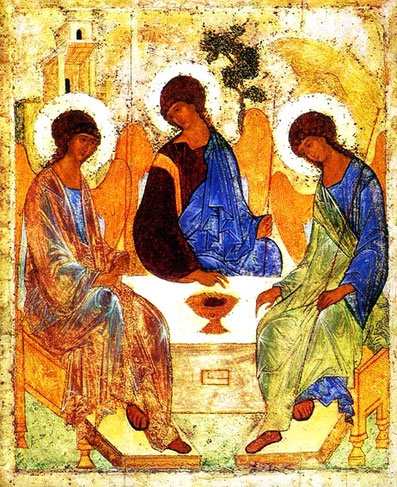 Bild: Der Laienmönch Andrej Rubljow hat ca. 1425 die drei Engel aus der Abraham-Sarah-Erzählung (Gen 18) erstmals „transparent“ gemalt („geschrieben“) hin auf die drei göttlichen Personen (Kloster Dreifaltigkeit und des hl. Sergius in Sergijew Possad nahe Moskau). Welcher Engel welche der drei Personen darstellt, ist offen. Für die einen ist die mittlere Person Gott-Vater, weil sie die anderen zwei überragt, andere sehen in ihr den Sohn und vom Betrachter aus in der linken den Vater, für wieder andere ist der linke der Hl. Geist. Die Blickrichtung geht von der Mitte nach links, dann zur rechten Figur, die nach unten oder zum Kelch in der Mitte schaut. Auch Kirche, Baum und Berg im Hintergrund sowie Farben und Handhaltungen lassen verschiedene Deutungen zu. Klar ist: Die Dreiheit bildet eine Einheit (Kreis) und ist so „männlich“, denn das Viereck (Altar) gilt als „irdisch“ und „weiblich“.
