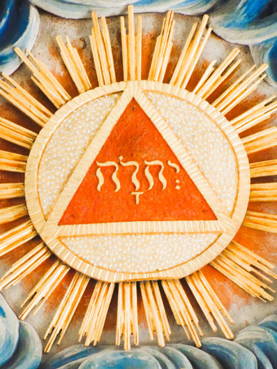 Bild: Die Zweiheit als Gegensatz im Endlichen kennzeichnet das Geschöpfliche, nicht das Göttliche. Eine Dualität des Göttlichen oder ein „binitarischer“ (zweifältiger) Gott wären „zwei Götter“, was nach Peter Schäfer mit Blick auf den „Menschensohn/ Mensch“ bei Daniel oder dem himmlischen Menschen „Henoch“ im Judentum diskutiert wurde (Zwei Götter im Himmel, 2017). Wohl gibt es zwei zentrale Gottesnamen: Elohim und JHWH, die man als Vater und Sohn verstehen könnte (Ezechiel gebraucht „Geist“ dann absolut). Die Dreiheit ist kein Plural wie „eine Vierheit, Fünfheit“ (so der jüdische Historiker Michael Wolfssohn), sondern eine strenge Einheit: Israels Glaubensbekenntnis „JHWH ist eins/einer“, JHWH echad (Dtn 6,4), ist in Zahlen 10-5-6-5 1-8-4 = 39, das ist 3 x 13, wobei die Zahl 13 biblisch für die jenseitige Einheit steht (jenseits der 12 als Zahl der Zeit), also 3 x 1. Das Tetragramm im Dreieck nach oben und Strahlenkranz in einer Kirche in Meißen.