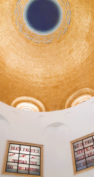 Bild: Das Fest Allerheiligen erinnert auch daran, dass alle Christen zur Heiligkeit berufen sind, wie das II. Vatikanum in Lumen gentium sagt: „Alle Christgläubigen sind also zum Streben nach Heiligkeit und ihrem Stand entsprechender Vollkommenheit eingeladen und verpflichtet" (LG 42). Durch die sieben Sakramente haben alle Gläubigen schon teil an der kommenden Welt des „achten Tages“ oder des Gelobtes Landes. Zu ihm hin ist das Volk Gottes unterwegs, das „mit Eile“ den Jordan durchschreiten soll. Das versteht Origenes auch von den Christen, was er mit den acht Seligpreisungen der Bergpredigt (Mt 5,3-10) verdeutlicht; auch sie dürfen „nicht müßig und schläfrig“ die Dinge betreiben, sondern in Eile, bis alles durchschritten, das heißt alles erfüllt ist: „‘Selig sind die Armen im Geiste‘, damit wir, alle Anmaßung ablegend und die Demut Christi annehmend, dadurch zur verheißenen Seligkeit zu gelangen verdienen. Aber auch wenn wir das schon erfüllten, so dürfen wir doch nicht stehen bleiben und aufhören, sondern auch alles Folgende ist zu durchschreiten“ (Geist und Feuer, 1938, 94-106, 96). Kirche der Seligpreisungen am Nordrand des Sees Genezareth in Israel mit achteckigem Grundriss.