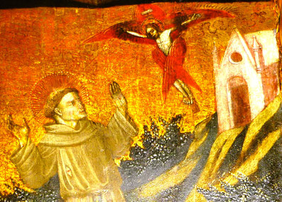 Am 29. September feiert die Kirche das Fest der drei Erzengel Michael, Gabriel und Raphael, am 2. Oktober das Schutzengelfest, am 4. Oktobe das Fest des. hl. Franziskus, dem der gekreuzigte Christus im Jahr 1224, zwei Jahre vor seinem Tod, in einer Vision als Seraph mit sechs Flügeln erscheint und ihm leibhaftig seine fünf Wundmale einprägt. Zuvor hat der Heilige „jedes Schreiben mit dem ‚Tau‘ unterzeichnet“, dem ursprünglich kreuzförmigen letzten Buchstaben des hebräischen Alphabets, das „zum Siegel der franziskanischen Familie geworden“ ist; mit diesem Kreuz-Siegel zeichnet der Engel die Stirn der Erlösten (Ez 9,4.6; Offb 7,2). Franz wurde nach Eugen Mederlet mit dem Empfang der Stigmata „wahrhaftig die irdische Gestalt jenes himmlischen Engels des sechsten Siegels. Er trägt das Siegel des lebendigen Gottes, die Wundmale, in seinem ganzen Wesen und drückt das Siegel des Kreuzes allen auf die Stirn, die sich retten lassen. Er schmückt mit dem ‚Tau‘ die Welt zur Hochzeit“ (Die Hochzeit des Lammes. Franziskus und die bräutliche Kirche, 1983, 153; 157). Zur Engelerfahrung des Franziskus bemerkt Mederlet: „Die Engelwelt war für seinen Blick von der irdischen, sichtbaren Welt nicht getrennt. Die Engel leben und wirken in dieser Welt und üben einen ständigen Einfluss aus. Die ganze Bibel offenbart uns, wie sie mit der Heilsgeschichte der Menschen aufs innigste verknüpft sind. Vom Paradies an, wo die Cherubim und das zuckende Flammenschwert den Weg zum Baume des Lebens bewachen (Gen 3,24), gestalten die Engel in unsichtbarem Wirken die Heilsgeschichte der Völker mit. Es gibt einen Engel des Perserreiches (Dan 10,13) und einen Engel Griechenlands (Dan 10,20). Die Geschichte Israels ist ohne die Engel nicht denkbar. (…) Die Engel sind so unzertrennlich verwoben mit der Heilsgeschichte der Welt, dass, wenn wir sie weglassen, wir keine wirkliche Vorstellung des Heils haben können. Auch sie gehören mit den Menschen zum einen Haupte Christus, aus dem sie ihr Leben und ihre Gnade empfangen, ‚denn in ihm ward alles erschaffen, was im Himmel und auf Erden ist, das Sichtbare und das Unsichtbare, mögen sie Throne oder Herrschaften oder Fürstentümer oder Mächte heißen. Das Gesamt ist durch ihn und zu ihm hin geschaffen‘ [Kol 1,16]“ (44f). Franziskus schaute den „lebensspendenden Urgrund der Dinge“ (2 Cel. 165) und verstand „die Sprache Gottes“ in der ursprünglichen Schöpfung (11). Für den heiligen Bonaventura war mit Franziskus als Engel mit dem ‚Siegel Gottes‘ die Kirchengeschichte bereits in das letzte Stadium der ‚End-Zeit‘ eingetreten.