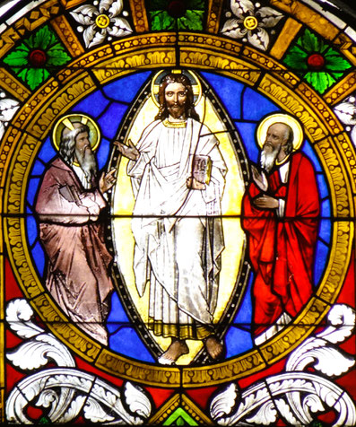 Bild: Jesu „Verklärung“ (metamorphosis, transfiguration), gefeiert am 6. August, weist ihn nicht nur als „geliebten Sohn Gottes“ aus – „auf ihn sollte ihr hören“ (Mt 19,6), nicht (nur) auf Mose (Gesetz) und Elija (Propheten) –, sondern auch als neuen Adam. Denn das strahlendweiße Lichtkleid (V.2) erinnert an das „ursprüngliche Kleid“ (Lk 15,22) der Herrlichkeit (doxa) Gottes, das Adam und Eva vor ihrem Fall getragen haben und sich deshalb nicht „schämen“ mussten (Gen 2,25) wie hinterher, so dass sie nach dem Pflanzenkleid (Feigenblatt) und dem Tierkleid (Fell) verlangen mussten. In Jesus wird der Mensch in seiner ursprünglichen, gottgewollten „Schönheit“ wiederhergestellt: Er ist „der Schönste von allen Menschen“ (Ps 45,3). Der verklärte Jesus im weißen Lichtgewand zwischen Elija rechts und Mose links: Dom zu Regensburg.